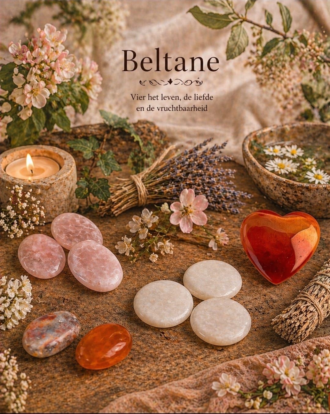 - 1x Rozenkwarts / Steen 4- 6 cm- Een steen die symbool staat voor liefde, verbinding en het Hartchakra, passend bij de romantische en verbindende sfeer van Beltane
