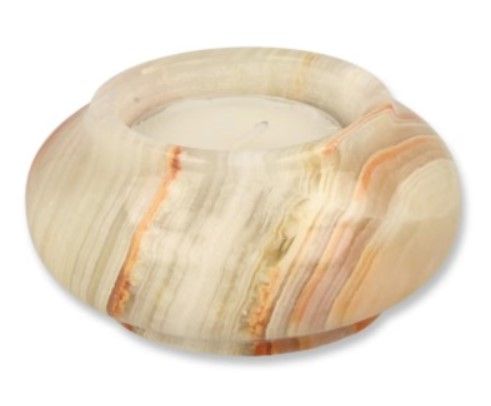 Waxinelichthouder van de half-edelsteen Aragoniet (Onyxmarmer) in een mooie ronde vorm met een diameter van ongeveer 7,5 cm. Onyx marmer is een combinatie van Groene Aragoniet met Calciet.